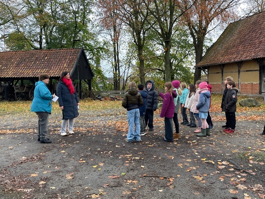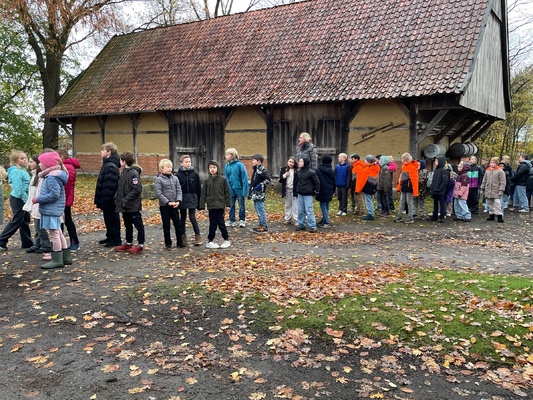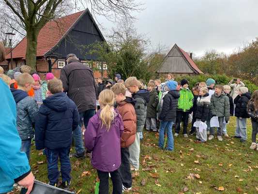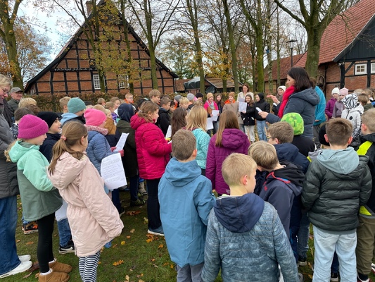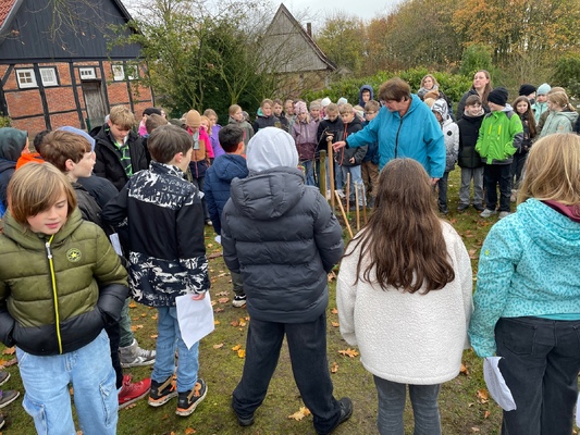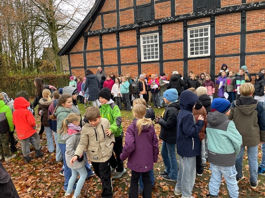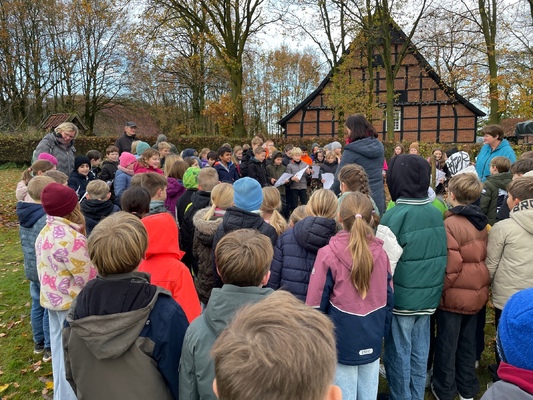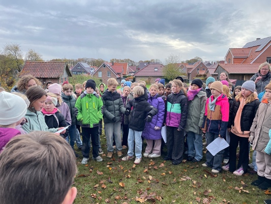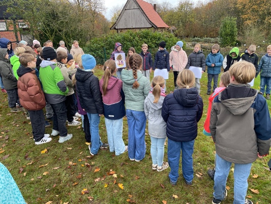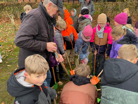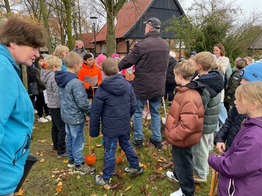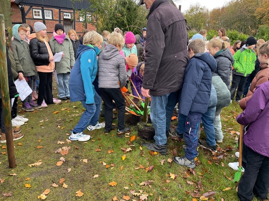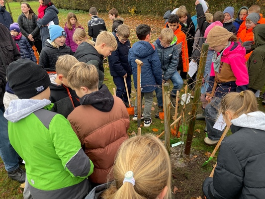Am 17.11.2025pflanzten die Kinder der 4. Klassen der Waldschule Leschede und der Joseph- Tiesmeyer Schule eine Buche mit dreifarbigen Blättern.